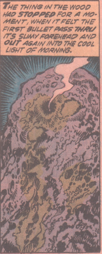Apparently, Marvel had the idea of turning “It” into an ongoing series. But what good would it have done to set one swamp monster against another from the same publisher? Man-Thing had done well enough to was doing reasonably well. Was there enough market for two Marvel swamp monsters? Thomas didn’t think so. So “It” remained a one-off from Supernatural Thrillers. Unfortunately, Marvel has lost the contract Sturgeon signed, so it was reprinted once. Beyond that, it’s in legal limbo, since no one knows the terms of the contract. So muck monster completist’s only hope of finding the story is to buy an old comic. Luckily, it’s not enormously popular, so copies are relatively inexpensive. It's a good single issue, and brings the origin of the swamp monster back to its origin, the Theodore Sturgeon story. But it's a single issue, so there's really not a lot to dig into here.